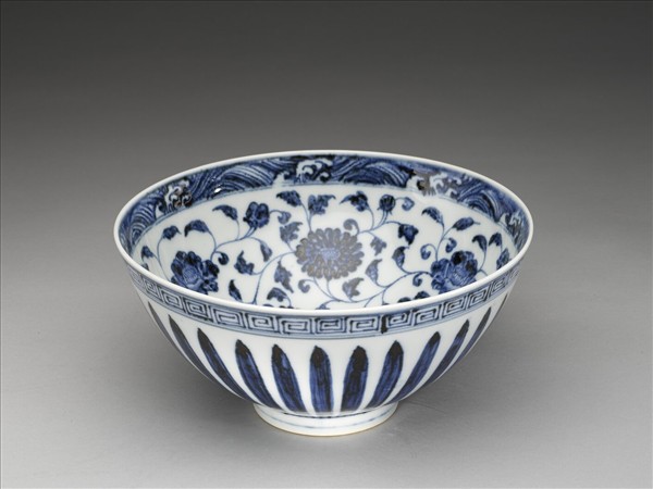 敞口,深壁上豐下斂,尖底,矮圈足,通稱「蓮子碗」。內口沿下畫波濤紋一周,加飾青線三道,周壁畫纏枝牡丹、菊花各三朵,碗心畫枇杷一枝,邊飾雙線。外口沿下畫回紋一周,加飾青線三道,周壁畫菊瓣紋,足飾青線二道。