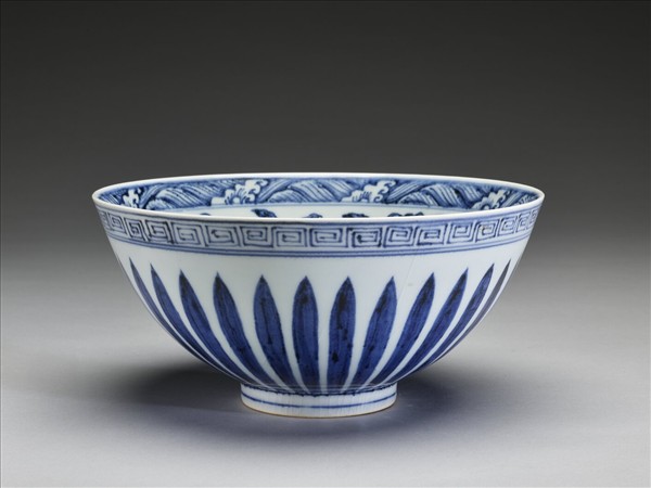 敞口,深壁上豐下斂,尖底,矮圈足,通稱「蓮子碗」。內口沿下畫波濤紋一周,加飾青線三道,周壁畫纏枝牡丹、菊花各三朵,碗心畫枇杷一枝,邊飾雙線。外口沿下畫回紋一周,加飾青線三道,周壁畫菊瓣紋,足飾青線二道。