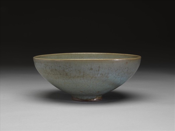 斂圓口,深弧壁,圜底並有矮圈足。施釉為天青色釉,釉色則呈青中帶灰。釉表面開棕色紋片,外弧壁垂流天藍色彩釉,口沿一道褐色邊。圈足外壁局部沾厚釉,圈足外壁、底緣與內壁無釉處,皆露褐色胎。