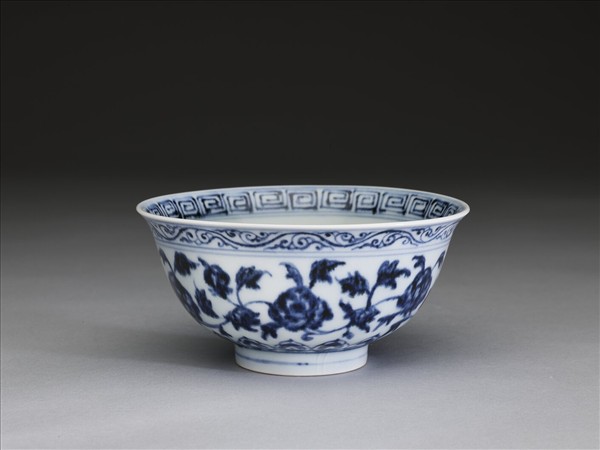 侈口窄唇,深壁,矮圈足。薄胎白釉。口唇上畫回紋一周,內壁純白無紋飾,碗心畫番蓮一枝。外壁畫纏枝牡丹六朵,口沿下畫卷草紋,底邊畫如意雲紋。內外花紋間加飾青線十道。