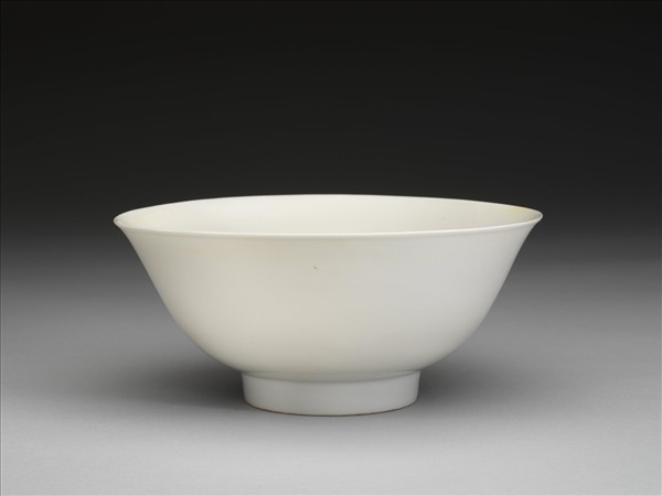 撇口窄唇,深壁,圈足。甜白釉,樸素無紋。底有青花書「大明成化年製」雙圈六字楷款。款字青色濃聚。