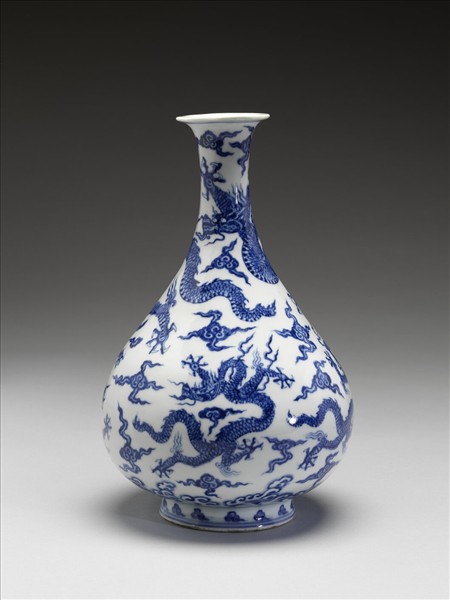 玉壺春瓶,撇口,器腹重心低,圈足外翻。口緣飾兩道青線,器頸與器身描繪雙角五爪龍四條,間以四腳雲紋,足內無款。1984 年珠山永樂地層曾出現器形與之相仿的作品,但其圈足製作模式與永樂朝不同,又考察鱗片、龍爪與雲紋的描繪方式,風格介於永宣與成化、弘治之間;因此,本件作品的製作年代可能落於明代正統、景泰、天順三朝,亦即瓷器不落官款的「空白期」或「黑暗期」間。