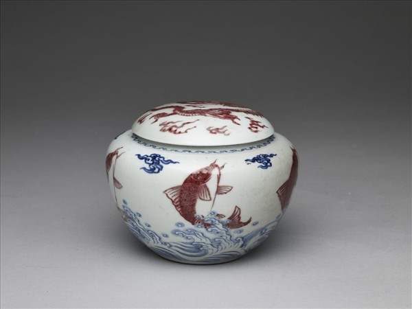 青花釉裡紅魚龍紋蓋罐