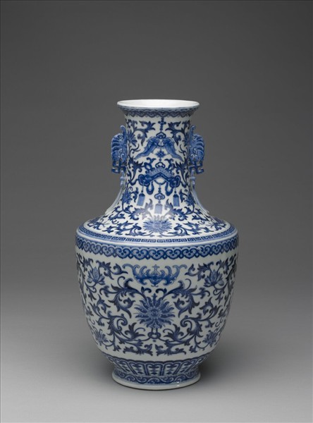 侈口窄唇,長頸兩龍首耳,闊肩,腹部上豐下稍斂,矮圈足。胎骨稍厚,頸上青花畫纏枝番蓮花、加飾雙魚、懸磬。口、肩分畫回紋與如意雲各一道。腹部畫纏枝番蓮花,加飾蝙蝠二隻,上下分飾如意雲與蓮瓣紋各一道。足畫轉枝花葉。兩耳滿染青花。底均有青花書「大清乾隆年製」六篆字款。