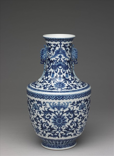 侈口窄唇,長頸兩龍首耳,闊肩,腹部上豐下稍斂,矮圈足。胎骨稍厚,頸上青花畫纏枝番蓮花、加飾雙魚、懸磬。口、肩分畫回紋與如意雲各一道。腹部畫纏枝番蓮花,加飾蝙蝠二隻,上下分飾如意雲與蓮瓣紋各一道。足畫轉枝花葉。兩耳滿染青花。底均有青花書「大清乾隆年製」六篆字款。
