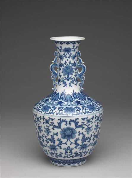 侈口窄唇,長頸兩龍首耳,闊肩,腹部上豐下稍斂,矮圈足。胎骨稍厚,頸上青花畫纏枝番蓮花、加飾雙魚、懸磬。口、肩分畫回紋與如意雲各一道。腹部畫纏枝花卉,加飾蝙蝠二隻,上下分飾如意雲與蓮瓣紋各一道。足畫轉枝花葉。兩耳滿染青花。