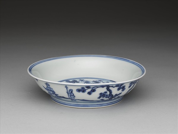 侈口窄唇,淺弧壁,盤心內凹,矮圈足。盤心繪松、竹、梅,加飾湖石、蘭草、靈芝,內壁純白無紋。外壁畫山景花木,一將士端坐正中,二侍衛側立,旁立者執矛,前立者持劍,一士人跪地作揖,旁罝一提梁爐或籃子,似描寫歷史人物故事,內外口足間加飾青線十道。釉色青重,帶褐綠疵斑。胎骨勻厚,圈足細窄,胎質潔白細膩。底書「大明宣德年製」二行六字楷款,外加雙圈。