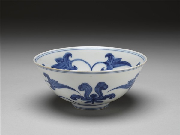 侈口,深壁,矮圈足。內外壁各畫萱草二組。碗心畫萱草一朵,內外分飾青線九道。底有青花書「大明成化年製」六字二行楷款,外加雙圈。