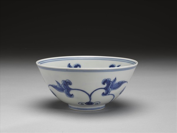 侈口,深壁,矮圈足。內外壁各畫萱草二組。碗心畫萱草一朵,內外分飾青線九道。底有青花書「大明成化年製」六字二行楷款,外加雙圈。