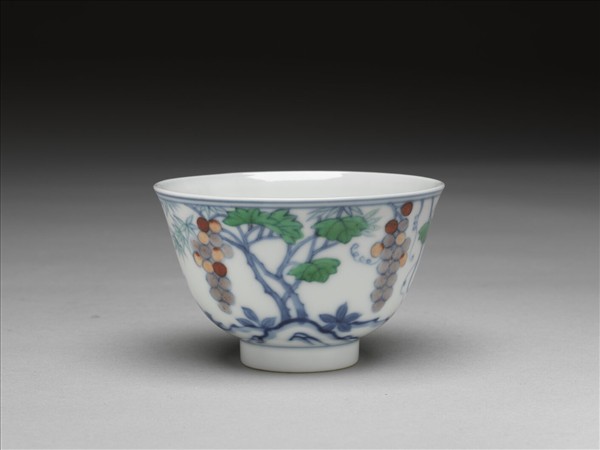 侈口窄唇,深壁,矮圈足。外壁彩畫葡萄、桑椹各一株,飾以坡陀、淺草,口足分飾青線三道。內面純白無紋飾。底有青花書「大明成化年製」六字二行楷款,外加雙方圈。
