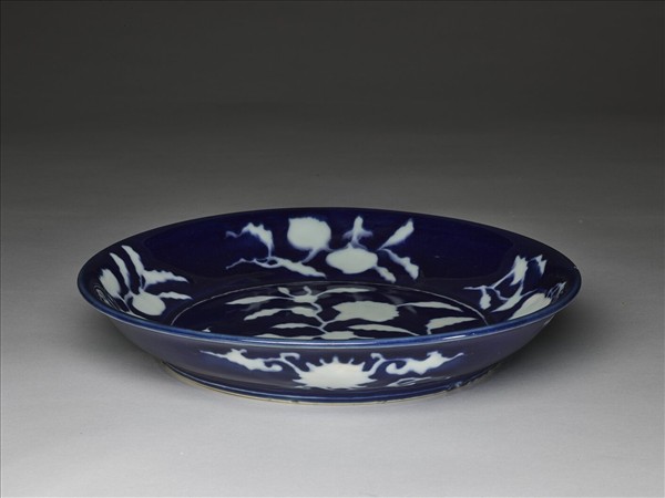 侈口窄唇,淺壁,矮圈足。內壁飾折枝花果四種,盤心飾花卉一枝,外壁飾番蓮四枝。霽青地,勾勒白釉花果,內外加飾白線三道。外口沿下有青花書「大明宣德年製」單行六字楷款。