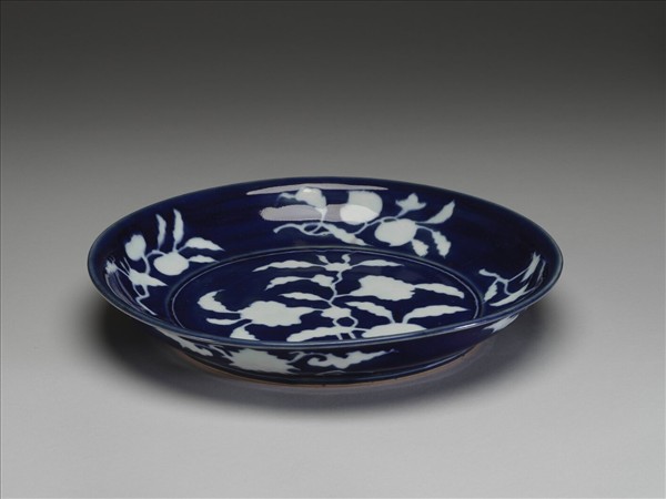 侈口窄唇,淺壁,矮圈足。內壁飾折枝花果四種,盤心飾花卉一枝,外壁飾番蓮四枝。霽青地,勾勒白釉花果,內外加飾白線三道。外口沿下有青花書「大明宣德年製」單行六字楷款。