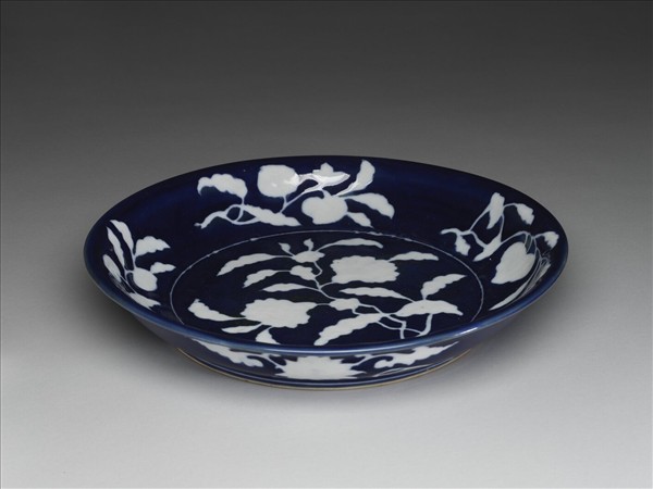 侈口窄唇,淺壁,矮圈足。內壁飾折枝花果四種,盤心飾花卉一枝,外壁飾番蓮四枝。霽青地,勾勒白釉花果,內外加飾白線三道。外口沿下有青花書「大明宣德年製」單行六字楷款。