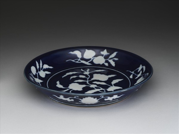 侈口窄唇,淺壁,矮圈足。內壁飾折枝花果四種,盤心飾花卉一枝,外壁飾番蓮四枝。霽青地,勾勒白釉花果,內外加飾白線三道。外口沿下有青花書「大明宣德年製」單行六字楷款。