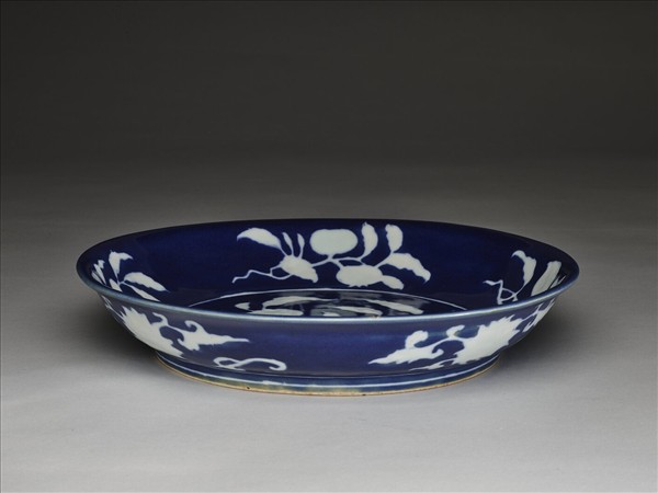 侈口窄唇,淺壁,矮圈足。內壁飾折枝花果四種,盤心飾花卉一枝,外壁飾番蓮四枝。霽青地,勾勒白釉花果,內外加飾白線三道。外口沿下有青花書「大明宣德年製」單行六字楷款。