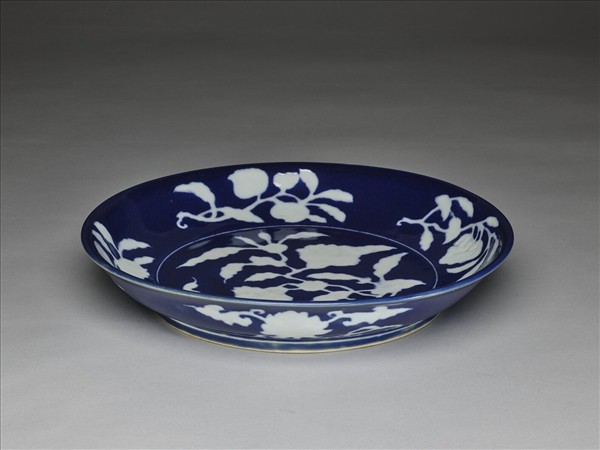 侈口窄唇,淺壁,矮圈足。內壁飾折枝花果四種,盤心飾花卉一枝,外壁飾番蓮四枝。霽青地,勾勒白釉花果,內外加飾白線三道。外口沿下有青花書「大明宣德年製」單行六字楷款。