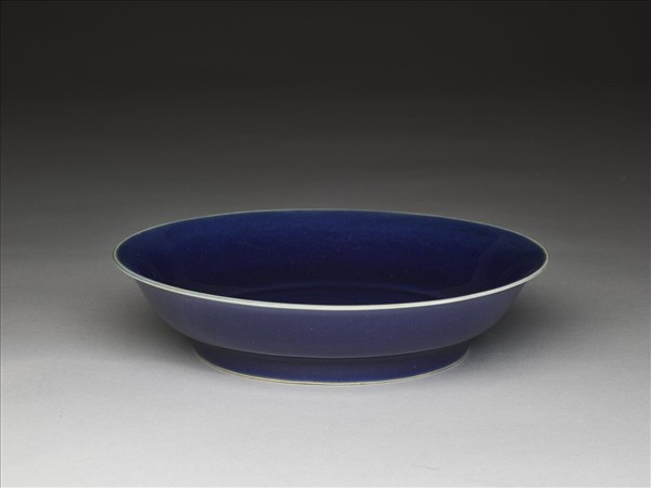 侈口窄唇,淺弧形壁,矮圈足。全器施霽青釉,施釉至足邊,口沿與足邊各留一道白邊,足緣無釉露白胎。足內壁及底施白釉,底有「大明宣德年製」六字二行楷體暗款,外加雙圈。