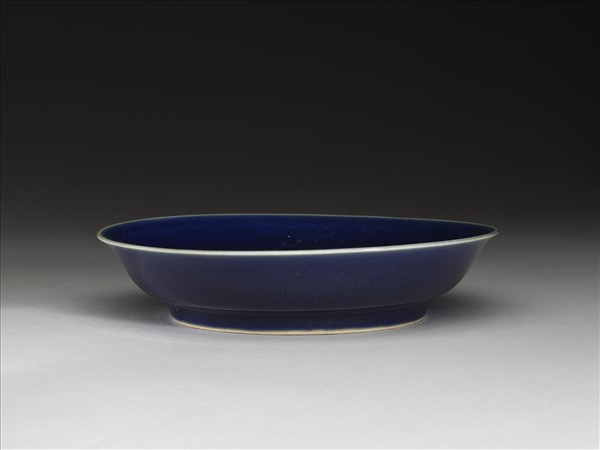 侈口窄唇,淺弧形壁,矮圈足。全器施霽青釉,施釉至足邊,口沿與足邊各留一道白邊,足緣無釉露白胎。足內壁及底施白釉,底有「大明宣德年製」六字二行楷體暗款,外加雙圈。