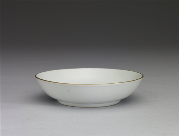 碟,侈口,弧壁,平底,矮圈足,口塗金。全器施白釉,足底露胎呈橘黃色,還有墊沙。