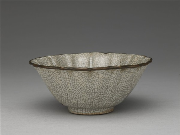 七瓣菱花式碗,侈口,深壁,矮圈足。薄胎骨,通體施灰白色釉,釉面佈滿細碎褐色開片。圈足內底施釉,足圈底緣無釉,露出褐色胎。口沿嵌銅釦。