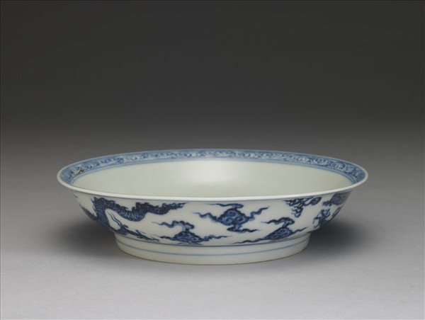 侈口微撇,淺壁,矮圈足。胎骨較薄。足圈底緣無釉露胎。外壁畫雙龍戲珠圖案,隙地加飾朵雲,口沿及圈足共飾青線三道。器內口沿下方繪飾一道卷草紋,盤心雙圈弦紋內劃三朵雲紋。器底無款。