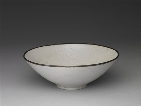 白瓷大碗,敞口、深壁、圈足,全器滿釉,僅口緣芒口無釉,鑲銅稜釦。胎質、施釉手法、流釉現象等均為定窯特色。器裡印花為飾:口緣細回紋一周,器壁荷塘圖景,與慈菰水草等成叢挺立,間以水鳥鷺鷥、鴛鴦、鵝、鴨等棲游其間,細密流動的水波線紋佈滿空間,是佈局、寫生均佳的花鳥圖,而印模雕刻細膩,線條清晰銳利。裡心因印模壓印稍凹陷,勒出圓形底部,印出水波雙魚紋。南宋各遺址、墓葬出土的定窯白瓷器甚多,印花的比例亦高。此碗的形制、花紋,與江蘇江浦張同之妻章氏墓(1199)相似;而該碗包鑲寬銀釦邊。出土紀年印模與此件造型、佈局相似者,如大定二十四年(1184)、大定二十九年(1189)、泰和三年(1203)等,年代也都相當,故為當時代金地所生產的作品而流入南方者。