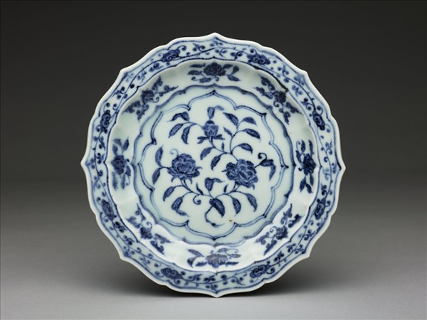 盤子模製而成,呈八瓣葵花形,折沿,帶寬唇,低淺壁,矮圈足。胎骨較厚,除器底無釉露胎外,內外壁皆以青花為飾,青料發色濃重。口唇上畫轉枝靈芝八朵,內外壁各畫花卉八枝,盤心一周加雙鈎菱花邊二層,中間再以折枝雙牡丹為主要紋飾。同樣的作品在伊朗的阿德卑爾神廟(Ardebil Shrine)收藏中也可以看到。