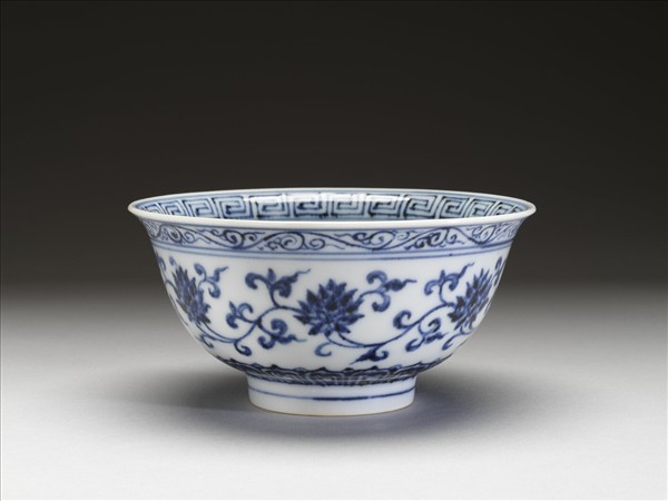 侈口窄唇,深壁,矮圈口。薄胎白釉。口唇上畫回紋一周,內壁純白無紋飾,碗心畫菊花一枝。外壁畫纏枝番蓮六朵,口沿下畫卷草紋,底邊畫蓮瓣紋。口足內外分飾青線八道。