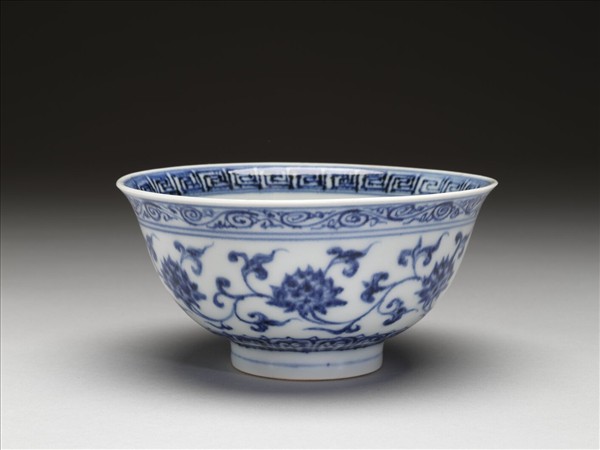 侈口窄唇,深壁,矮圈口。薄胎白釉。口唇上畫回紋一周,內壁純白無紋飾,碗心畫菊花一枝。外壁畫纏枝番蓮六朵,口沿下畫卷草紋,底邊畫蓮瓣紋。口足內外分飾青線八道。