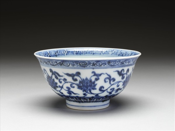 侈口窄唇,深壁,矮圈口。薄胎白釉。口唇上畫回紋一周,內壁純白無紋飾,碗心畫菊花一枝。外壁畫纏枝番蓮六朵,口沿下畫卷草紋,底邊畫蓮瓣紋。口足內外分飾青線八道。