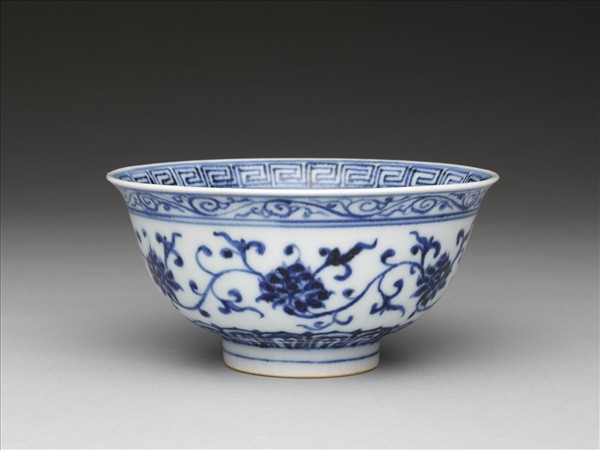 侈口窄唇,深壁,矮圈口。薄胎白釉。口唇上畫回紋一周,內壁純白無紋飾,碗心畫菊花一枝。外壁畫纏枝番蓮六朵,口沿下畫卷草紋,底邊畫蓮瓣紋。口足內外分飾青線八道。