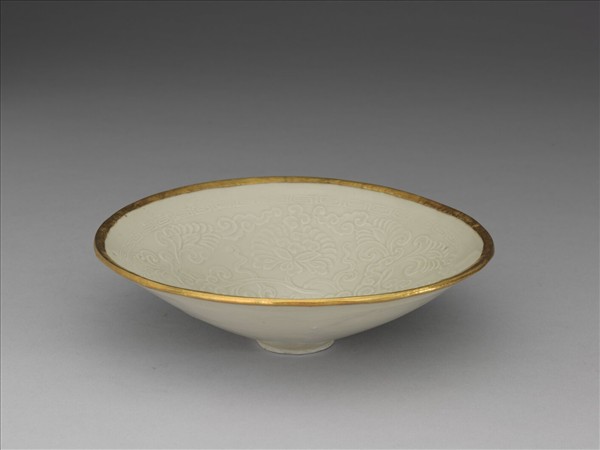 斗笠式碗,廣口、小底、斜直壁、矮圈足。口緣鑲金稜釦。內壁印花為飾,以三組纏枝菊紋滿佈壁面,回紋邊繞,底心葵花一朵。此種花瓣密佈於外圈的三角花形紋飾,有稱為菊紋者,在定窯中數量甚多,如南宋張重四(宣義)墓(1254年)出土笠式碗,或如大定二十四年(1184年)款印模、泰和三年(1203年)印模等的圖樣。而本件金釦難得,益形襯映瓷質素潔明晰。