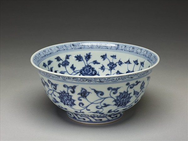 侈口窄唇,深壁,矮圈足。薄胎白釉。除器底外,內外皆以青花為飾。紋飾的部局相當規律:碗的開口口緣內外與足圈所繪紋飾,主要為回紋、轉枝花卉、波濤紋及勾雲紋這四種紋飾之組合;碗之內外壁與碗心則固定以牡丹、菊花、番蓮、茶花等四季花卉繪飾;碗之外壁底邊處則皆畫有蓮瓣紋。內外花紋間再加飾青線十至十二道。此種規律的佈局和變化多端的組合,反映出皇家用瓷特有的裝飾趣味。