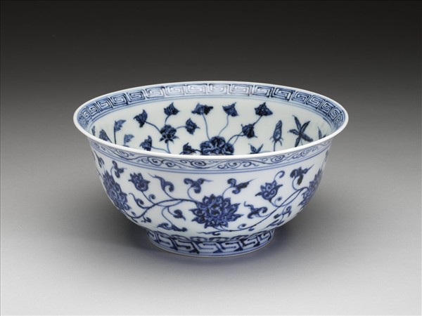 侈口窄唇,深壁,矮圈足。薄胎白釉。碗內口唇上畫回紋一周,內壁畫轉枝牡丹、菊花等六朵,碗心畫牡丹一枝。外面口沿下畫卷草紋,周壁畫纏枝番蓮六朵,底邊畫蓮瓣紋,足圈畫回紋,內外花紋間加飾青線十二道。