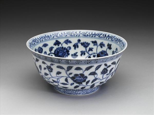 侈口窄唇,深壁,矮圈足。碗內口唇上畫轉枝菊花一周,內壁畫纏枝四季花五朵,碗心畫番蓮一枝。外面口沿下畫回紋一道,周壁畫纏枝番蓮五朵,底邊畫蓮瓣紋,足圈畫卷草紋。內外花紋間加飾青線十一道。