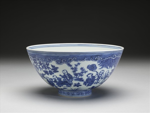 敞口,深壁,矮圈足。薄胎白釉。外壁畫庭園景物,十六孩童或坐或立嬉戲其間,足圈畫回紋一周,口沿內外各飾青線二道。碗內純白,樸素無紋飾。
