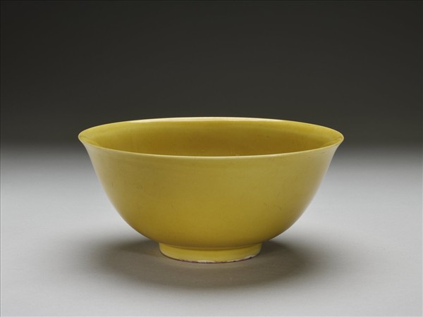 侈口窄唇,深壁,矮圈足。胎質較薄,器內外壁滿施嬌黃釉,樸素無紋飾。底有青花書「大明弘治年製」二行六字楷款,外加雙圈。