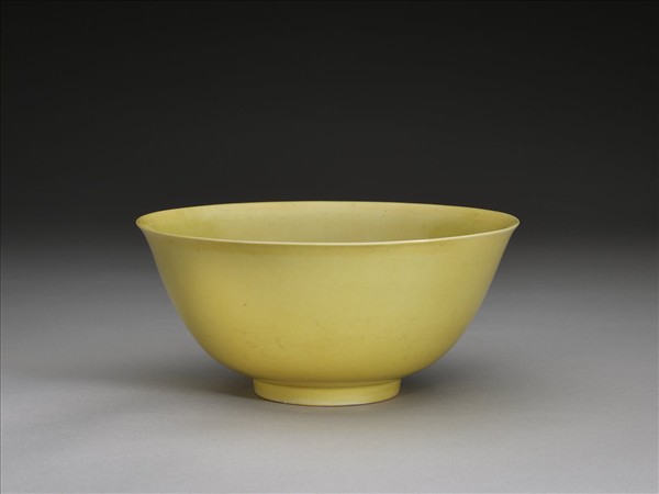 侈口窄唇,深壁,矮圈足。胎質較薄,器內外壁滿施嬌黃釉,樸素無紋飾。底有青花書「大明弘治年製」二行六字楷款,外加雙圈。