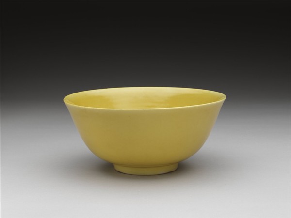 侈口窄唇,深壁,矮圈足。胎質較薄,器內外壁滿施嬌黃釉,樸素無紋飾。底有青花書「大明弘治年製」二行六字楷款,外加雙圈。