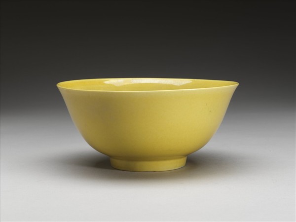 侈口窄唇,深壁,矮圈足。胎質較薄,器內外壁滿施嬌黃釉,樸素無紋飾。底有青花書「大明正德年製」二行六字楷款,外加雙圈。