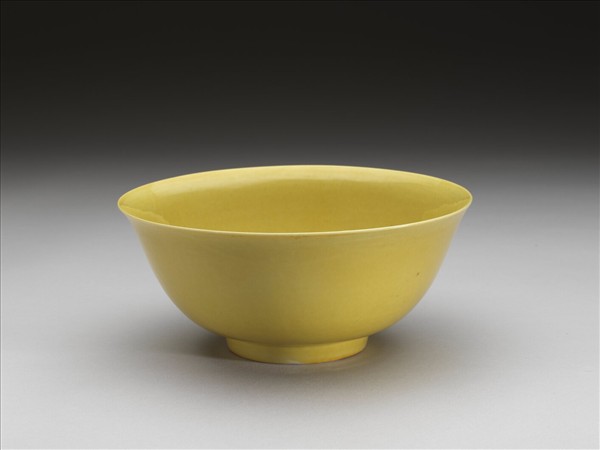 侈口窄唇,深壁,矮圈足。胎質較薄,器內外壁滿施嬌黃釉,樸素無紋飾。底有青花書「大明正德年製」二行六字楷款,外加雙圈。