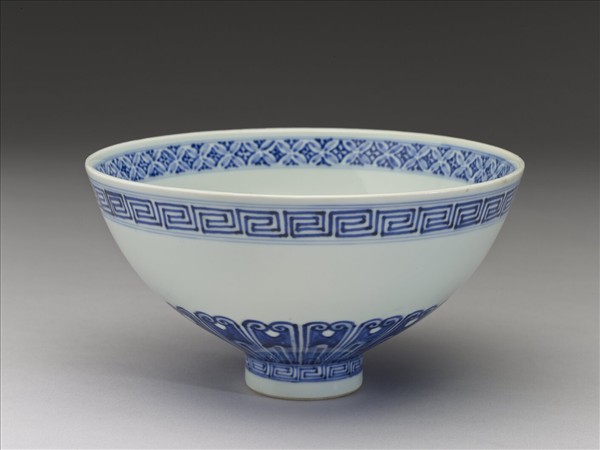敞口,深壁,尖底,矮圈足。碗內口沿下畫錢紋一周,碗心為八瓣圖案花一朵,應為變形蓮的一種,外加阿拉伯圖案紋二層。外壁口沿、圈足均飾回紋一周,底邊蓮瓣紋一周,中段留白。底有青花書「大明宣德年製」六字二行楷款,外加雙圈。