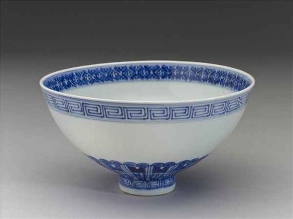 圓直口,深弧壁,小圈足,碗心內凹呈尖底狀,底微凸,俗稱雞心碗,一般因其碗形頗似蓮房,俗又稱「蓮子碗」。外壁口沿、圈足均飾回紋一周,底邊蓮瓣紋一周,中段留白。內口沿下畫錢紋一周,碗心為八瓣圖案花一朵,應為變形蓮的一種,外加阿拉伯圖案紋二層。胎骨均勻,圈足露胎,白胎細膩堅緻。底青花書「大明宣德年製」二行六字楷款,外加雙圈。