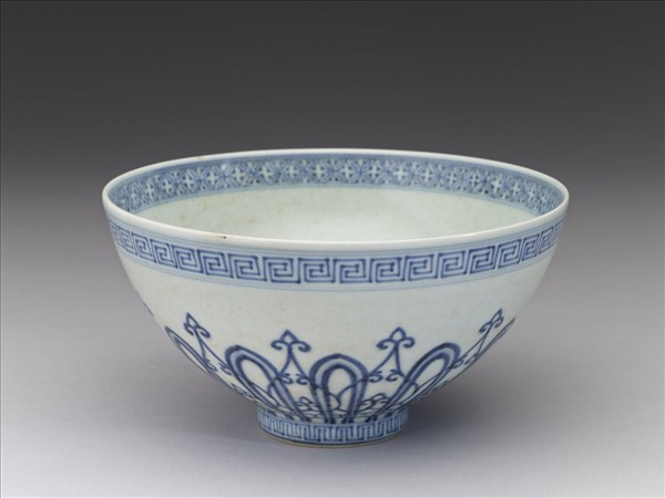 敞口,深壁,尖底,矮圈足。碗內口沿下畫錢紋一周,內壁畫阿拉伯圖案紋二層,碗心畫八瓣花一朵。外口沿下畫回紋一周,壁畫雙鈎蓮瓣紋,加飾桃形圖案。足圈畫回紋一周。底有青花書「大明宣德年製」二行六字楷款,外加雙圈。