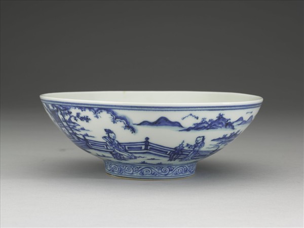 侈口,淺壁,矮圈足。外壁畫仕女、庭園及山景,足圈畫卷草紋一道。口足間加飾青線六線。內面純白,樸素無紋飾。底有青花書「大明宣德年製」二行六字楷款,外加雙圈。