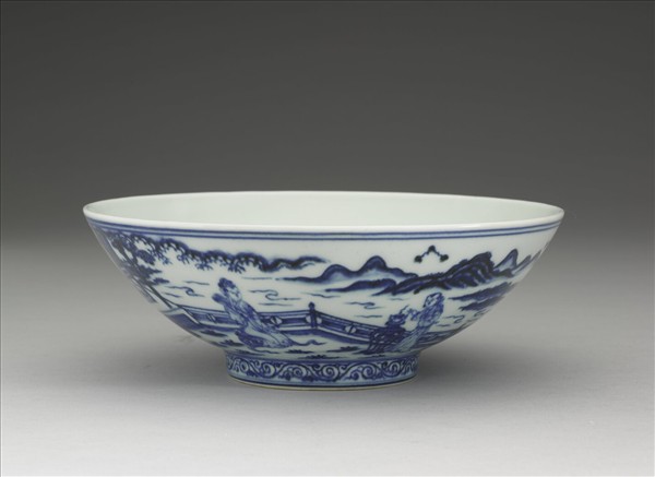 侈口,弧壁,矮圈足,底微凸。惟本器青花濃豔暈散,深淺不一,帶褐綠色斑及鐵褐色疵斑,釉面大小氣泡疏朗。由於白釉層較厚,輪廓線條青花暈散,故仕女面貌無前者之清秀雅麗。牽牛、織女雙星、捲邊雲紋或卷草紋均見暈散流淌痕蹟,因此紋飾釉色則無前器清晰明麗。碗內、器底白釉泛青,胎骨均勻,質堅細膩。器底青花書「大明宣德年製」二行六字楷款,外加雙圈。嘗見明載記宣德器上有題詩文者,迄今並未發現,故知所指或為此類詩意圖器,而不是器上題詩作文。