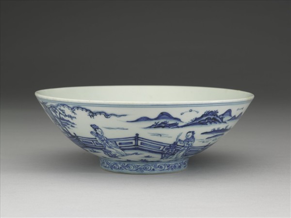 侈口,弧壁,矮圈足,底微凸。外壁畫庭園景物,一仕女坐於亭閣前,另三侍女,一燒香、一撲螢、一捧物由室內走出,室內紅燭高照,畫屏中置,足圈畫卷草紋一周,口足加飾青線六道,內壁白釉無紋。胎骨略厚,青花勻濃,圈足露胎,質堅細膩,偶有細小鐵質斑點。底書「大明宣德年製」二行六字楷款,外加雙圈。