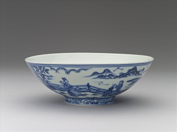 侈口,淺壁,矮圈足。外壁畫仕女、庭園及山景,足圈畫卷草紋一道。口足間加飾青線六線。內面純白,樸素無紋飾。底有青花書「大明宣德年製」二行六字楷款,外加雙圈。