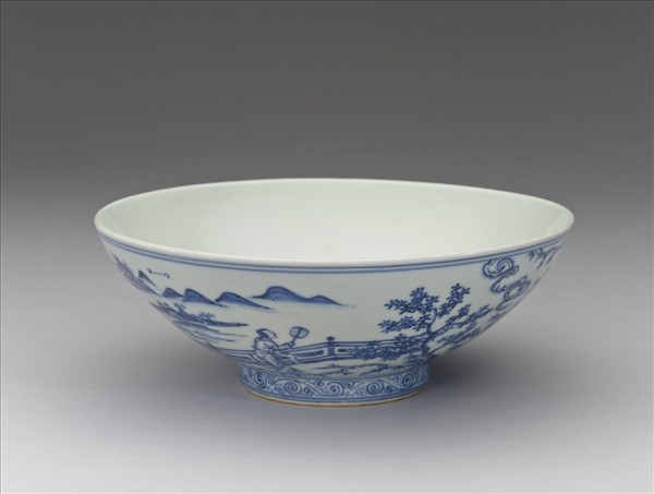 侈口,淺壁,矮圈足。外壁畫仕女、庭園及山景,足圈畫卷草紋一道。口足間加飾青線六線。內面純白,樸素無紋飾。底有青花書「大明宣德年製」二行六字楷款,外加雙圈。