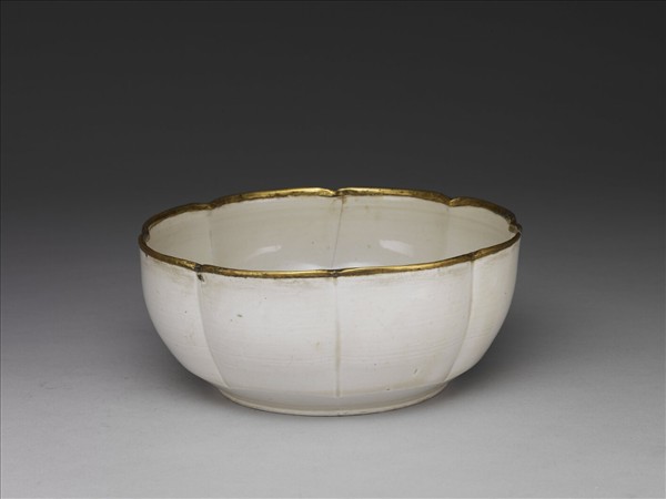 八瓣花式碗,直口深壁腹下漸收,器壁花稜深勒,矮圈足;口緣薄而花瓣曲弧明顯,鑲金釦;內底中心劃有蓮荷一枝,筆意簡率。全器滿釉,外壁見刷絲紋及淚痕的流釉。此種花式深腹缽狀的碗,常是酒具中溫酒之用,在宋代常有曲流注壺與注碗成組共出。